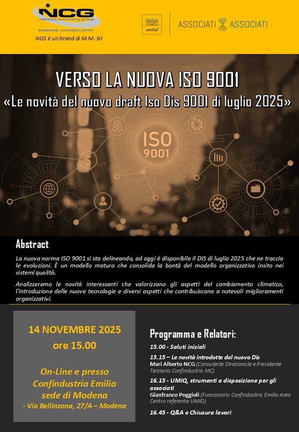 La nuova norma ISO 9001 si sta delineando, ad oggi è disponibile il DIS di luglio 2025 che ne traccia le evoluzioni. È un modello maturo che consolida la bontà del modello organizzativo insito nei sistemi qualità. Analizzeremo le novità interessanti che valorizzano gli aspetti del cambiamento climatico, l'introduzione delle nuove tecnologie e diversi aspetti che contribuiscono a notevoli miglioramenti organizzativi.