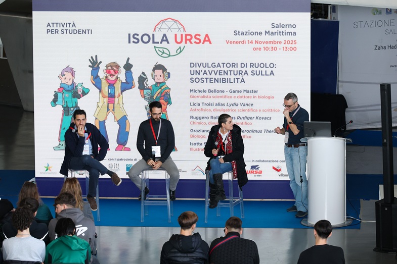 La giornata è iniziata con una mattina dedicata alle scuole superiori, che ha visto oltre 80 studenti in presenza e più di 450 in streaming partecipare al format narrativo-scientifico “Divulgatori di Ruolo: un’avventura sulla sostenibilità”. I noti divulgatori Licia Troisi, Ruggero Rollini, Graziano Ciocca, Sara Segantin (in modalità video dalla COP30 - Conferenza delle Parti dell'UNFCCC - che si sta svolgendo proprio in questi giorni in Brasile) e Michele Bellone come Game Master hanno portato i ragazzi in un’esperienza immersiva sulle tematiche della sostenibilità ambientale, arricchita dalle illustrazioni live della fumettista e illustratrice Isotta Santinelli, che ha trasformato il racconto in una narrazione visiva proiettata sul grande schermo.