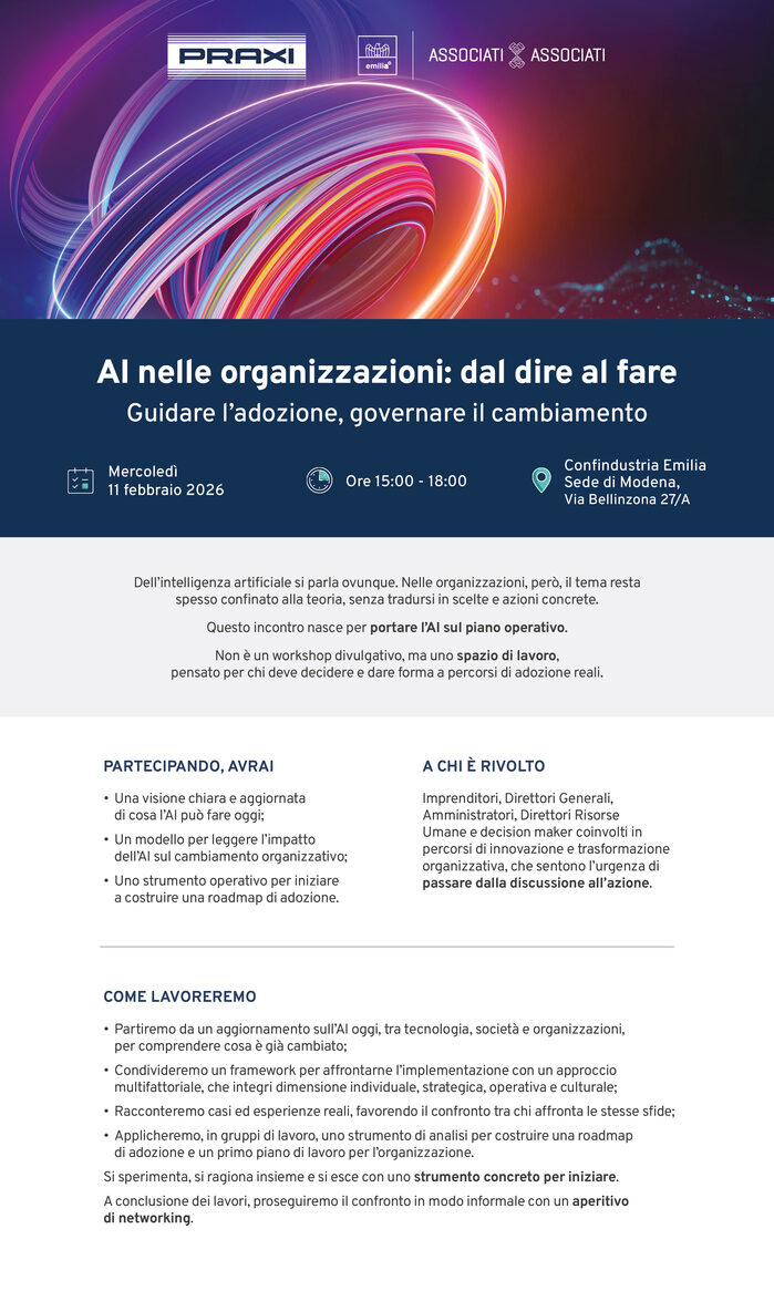 Un incontro operativo per supportare imprenditori e manager nel tradurre l’intelligenza artificiale in decisioni e azioni concrete, attraverso framework, casi reali e strumenti utili per avviare percorsi strutturati di adozione.