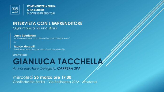 Marco Moscatti, Presidente del Gruppo Giovani Confindustria Emilia e Anna Spadafora, Direttore editoriale “La Città del Secondo Rinascimento”, intervisteranno Gianluca Tacchella, Amministratore Delegato di Carrera spa.