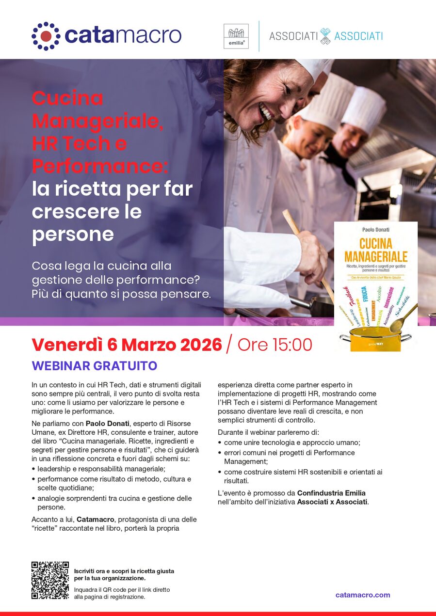 Con Paolo Donati esploreremo leadership, metodo e cultura attraverso analogie sorprendenti tra cucina e gestione delle persone. Con il contributo di Catamacro parleremo di HR Tech e Performance Management come leve reali di crescita.