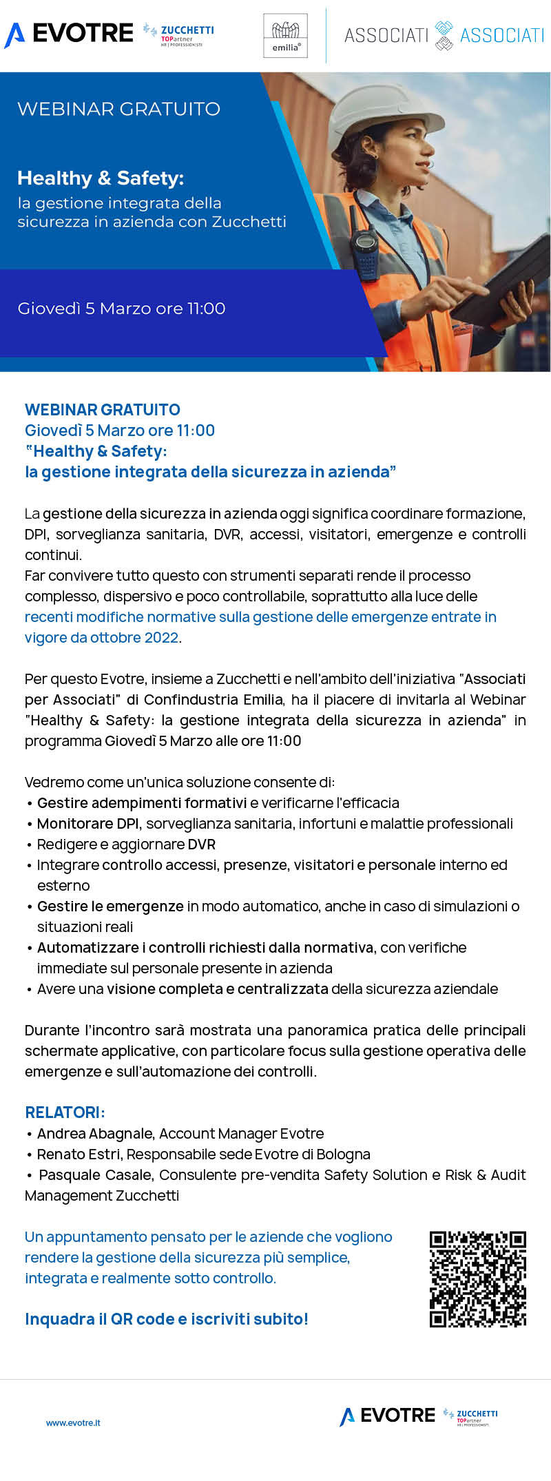 Evotre e Zucchetti ti invitano al webinar “Healthy & Safety: la gestione integrata della sicurezza in azienda”. Scopri come un’unica soluzione coordina formazione, DPI, sorveglianza sanitaria, DVR, accessi ed emergenze. Partecipa per vedere in pratica come automatizzare i controlli e semplificare la gestione della sicurezza aziendale.