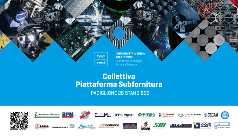 All’interno del Padiglione 26 – Stand B95, Confindustria Emilia ha organizzato una collettiva di 20 aziende del comparto della subfornitura meccanica ed elettronica: Antoniana Minuterie, BPM Meccanica, CMS, Cosma, Farbo, Fonderia Fomar Ghisa, Fratelli Vignoli, Gaser, Gulinelli, Vaccari Mauro, Gecam, Icos, Meccanica Sarti, Montek, Montirone, Pasquali, Sa&Bar, Studio Emme, Suzzi e Zani.