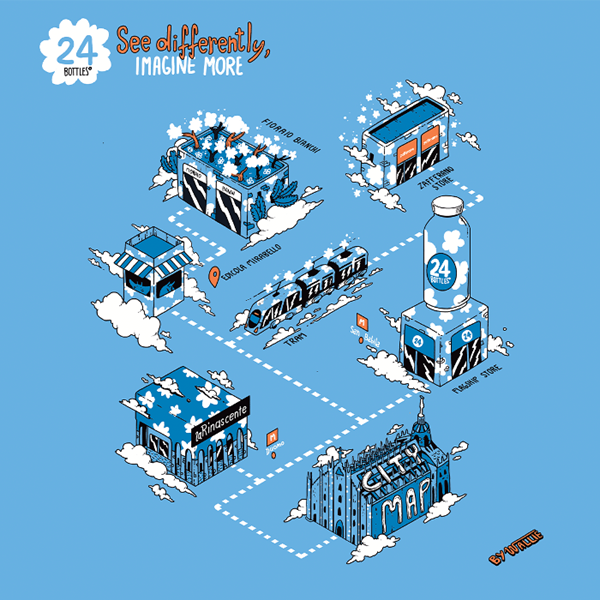 Per farsi guidare attraverso questa esplorazione, 24Bottles ha affidato il racconto della città alla mano sensibile e ironica dell’artista Wallie. La sua mappa d'autore è un diario visivo che trasforma ogni spostamento in un atto creativo.