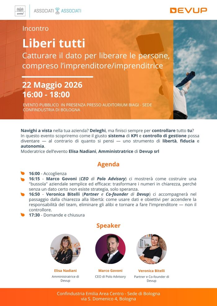 Vi siete mai chiesti perché, nonostante l'impegno, avete spesso la sensazione di navigare a vista? O perché, ogni volta che provate a delegare, finite per dover controllare tutto voi, altrimenti le cose non procedono come vorreste? Durante l'evento esploreremo il legame tra motivazione, coinvolgimento e performance attraverso un caso studio concreto di una PMI, dove la necessità di mantenere alta la motivazione e l'engagement dei dipendenti ha portato alla creazione di un sistema di KPI.