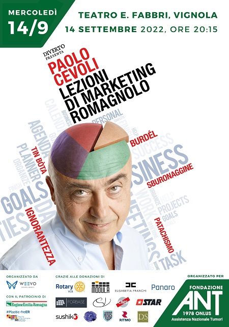 Lo spettacolo “Lezioni di marketing romagnolo” di Paolo Cevoli andrà in scena mercoledì 14 settembre alle 20:15 al Teatro E. Fabbri di Vignola (MO). Tutto il ricavato andrà a Fondazione ANT Italia Onlus, che da quasi 45 anni si prende cura dei malati oncologici del territorio e in tutta Italia.